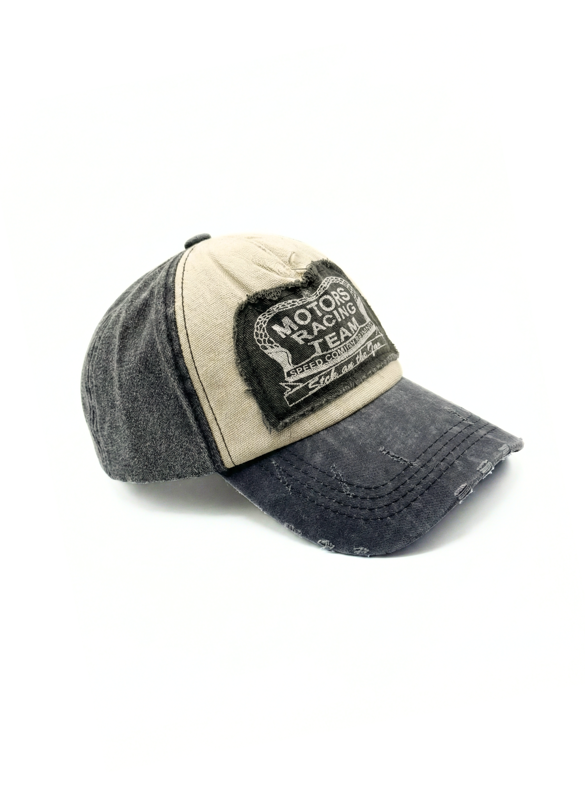 • Jockey Racer "Motors Racing Team" - Diseño vintage desgastado con parche bordado, estética de garaje y caminos polvorientos