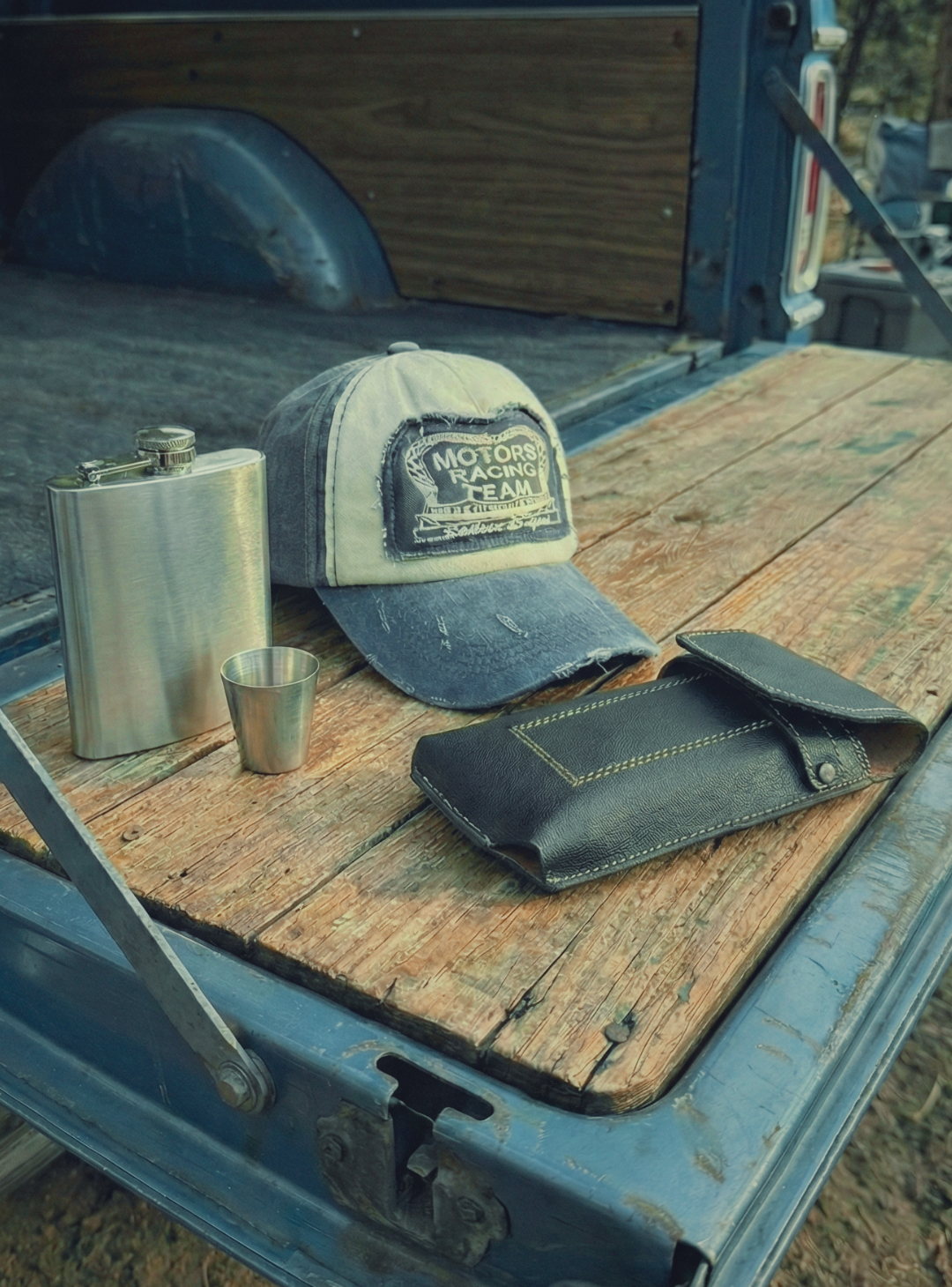 PACK GORRA RACER + PORTA CELULAR DE CUERO + PETACA ACERO INOXIDABLE